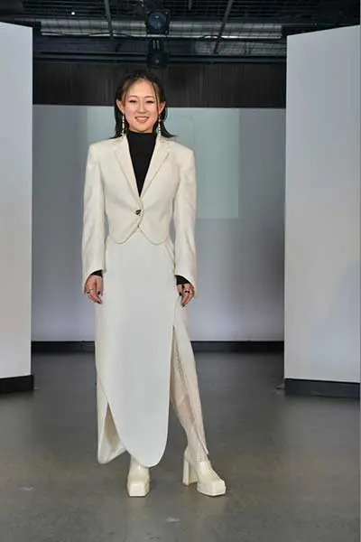 作品賞を頂くことができ、大変嬉しく思います。この作品のテーマは「rayon de lumiere」で、【暗いニュースが多い世界の中で、『ファッション』という『一筋の光』で世界を照らす。】というコンセプトで制作しました。素材やシルエットにこだわり、影と光のコントラストを表現しました。